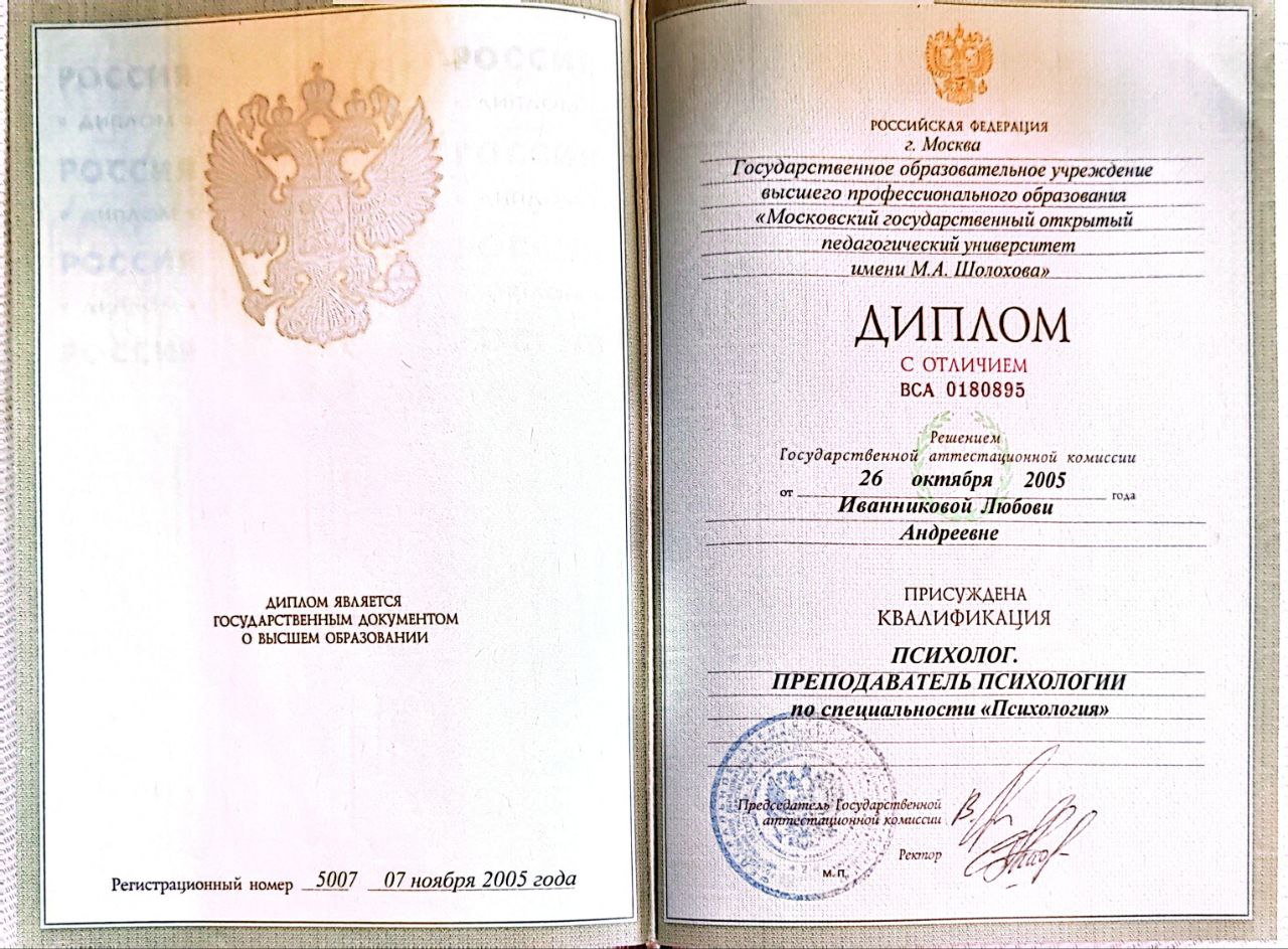 - 2000-2005 ПСИХОЛОГИЯвысшее образование – Психолог, МГГУ им. Шолохова г.Москва