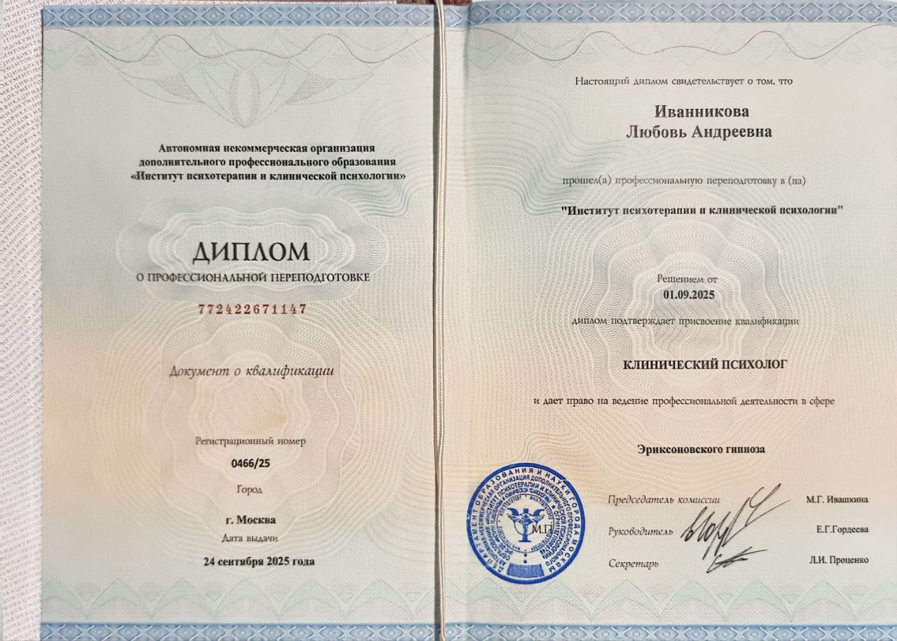 - 2025г.Профессиональная переподготовка в Институте психотерапии и клинической психологии. Квалификация "Клинический психолог"