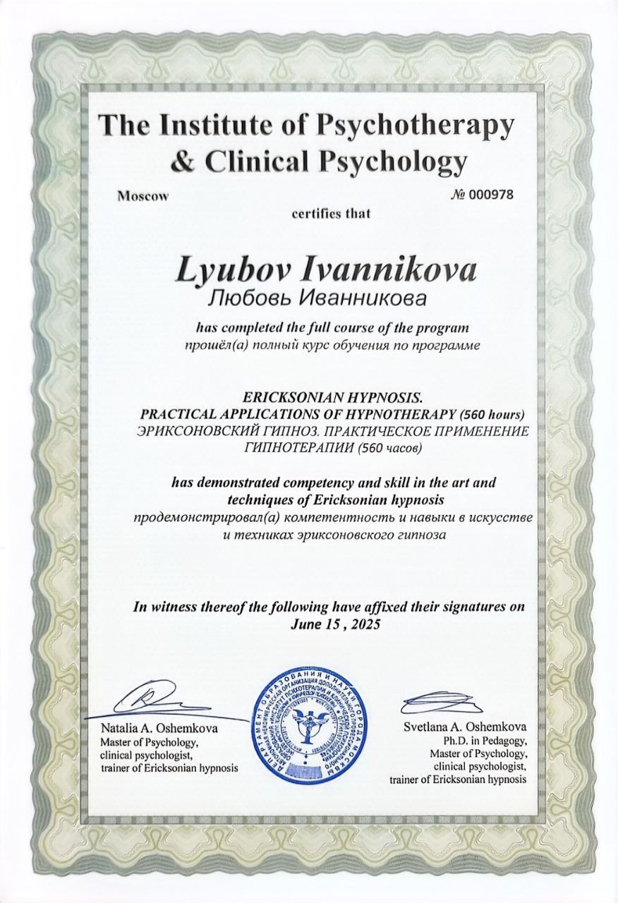 - 2025г.Курс обучения по программе "Эриксоновский гипноз. Практическое применения гипнотерапии"