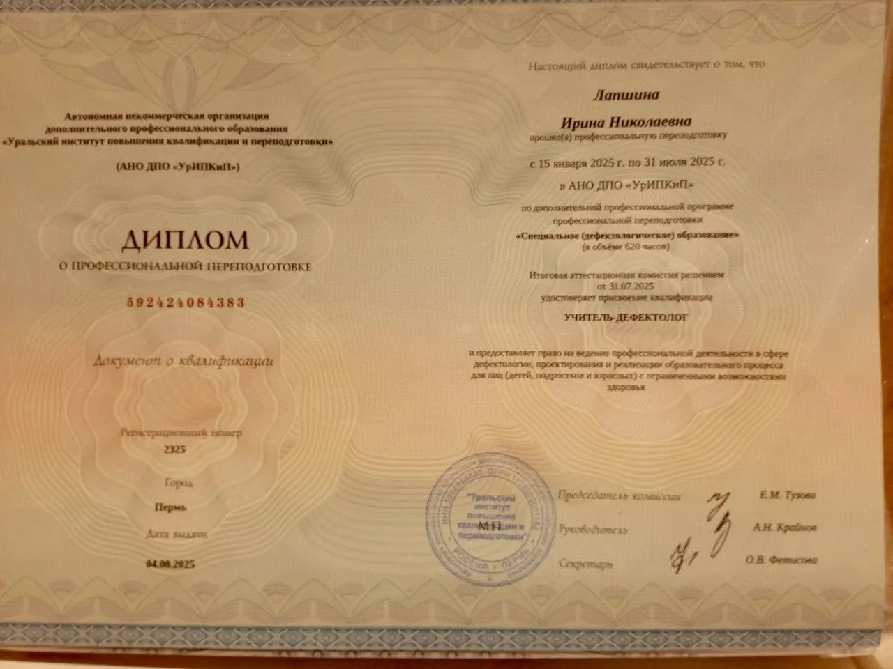 - «Специальное (дефектологическое) образование», диплом о профпереподготовке (дефектолог)