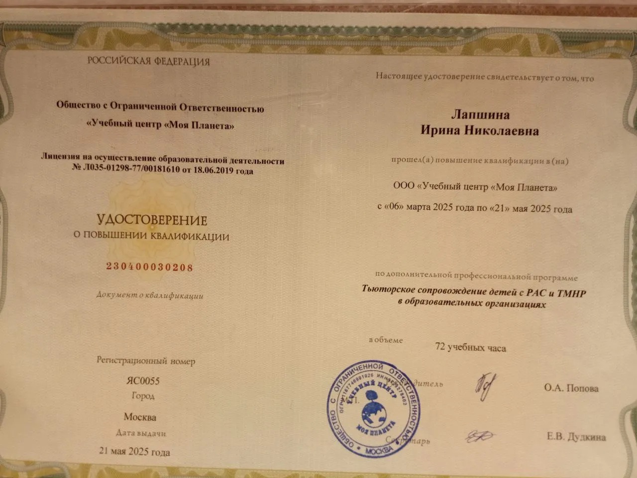 АНО «Моя Планета»- «Тьюторское сопровождение для детей с РАС в образовательных организациях» (повышение квалификации), тьютор