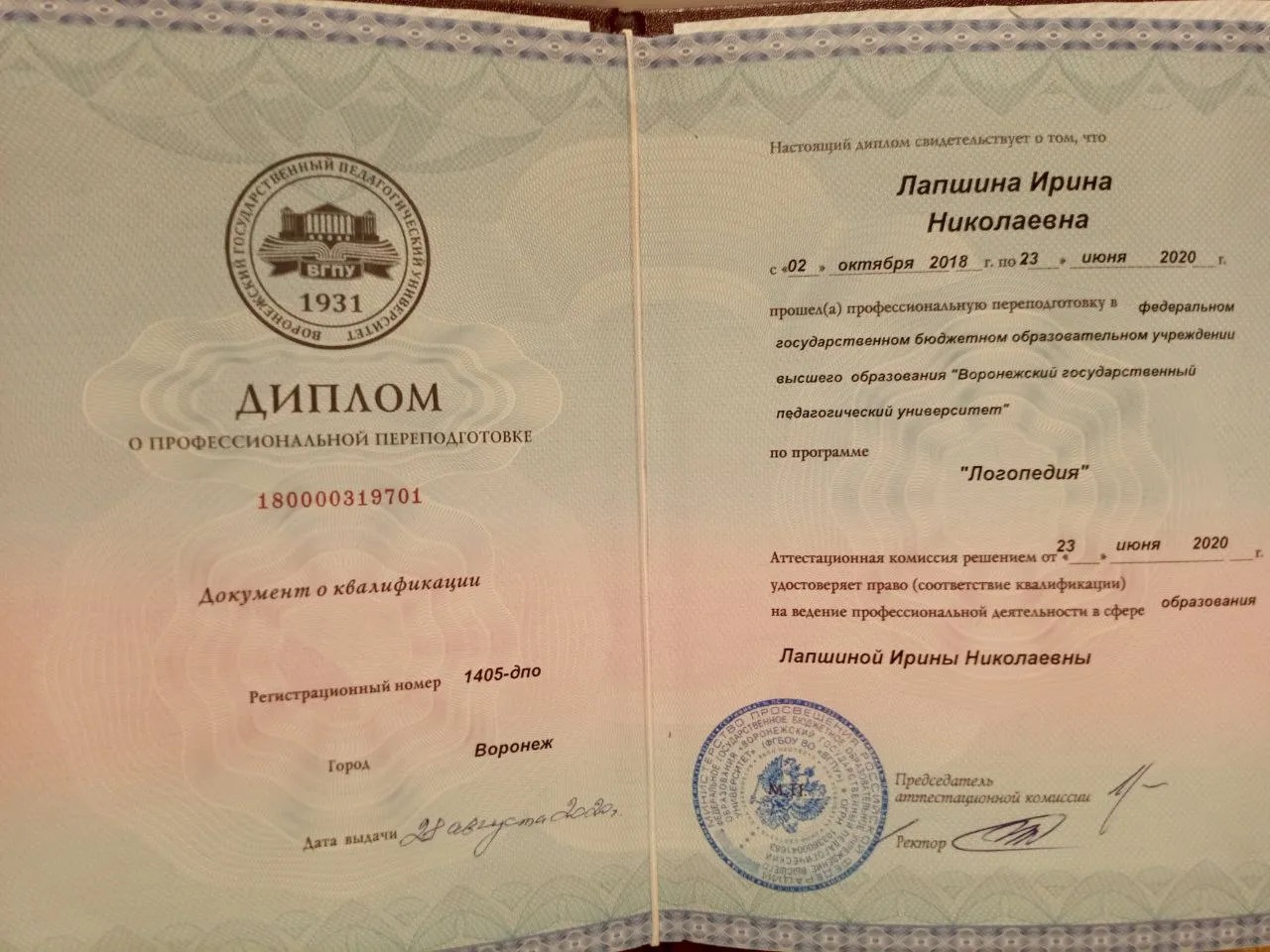 ВГПУ - диплом о профессиональной переподготовке, логопед