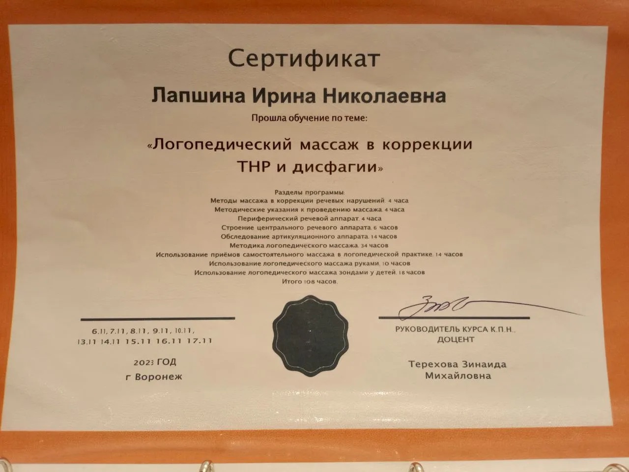 - «Запуск речи у неговорящих детей. Специфика организации и проведения логопедической работы», 2023 г. (повышение квалификации)